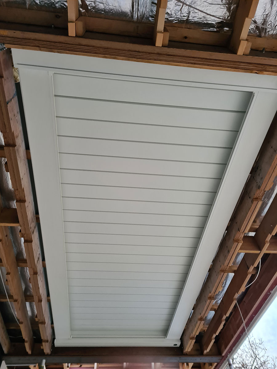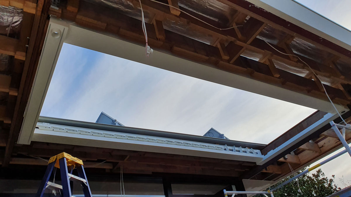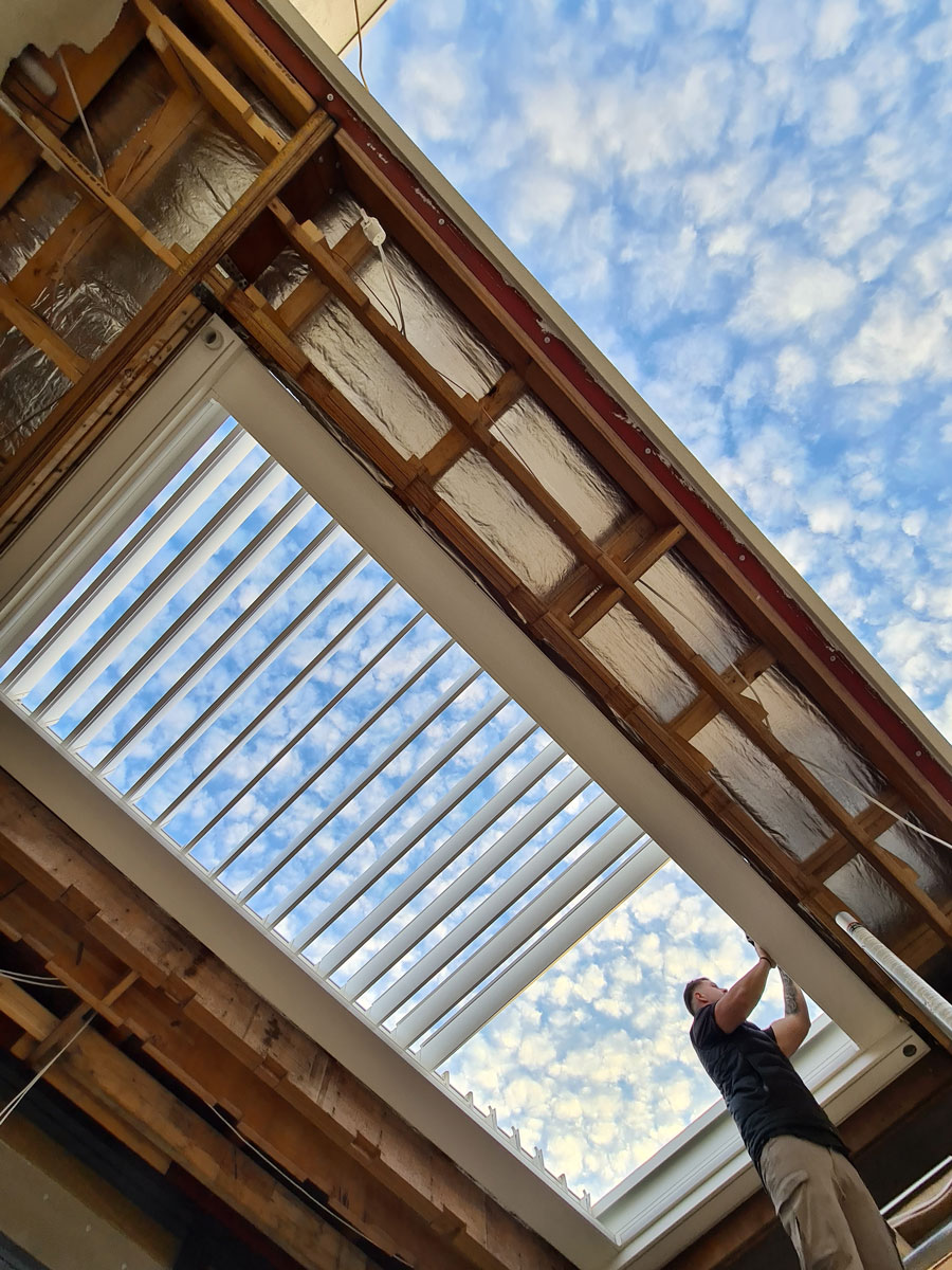With dimensions undertaken carefully and with precision the build went according to plan, upon arrival we packed out the two ends and bolted the motor and projected side beams to the structural timber in the void before carefully raising the heavier gutter beams containing the louvre components into their required positions via duct lifter. Minor adjustments to the connection details had to be made due to access from the roof and once fastened we were able to position the motors and undertake the electrical fit off for multiple lighting LED extras. Each Aerolux system is fitted with two Somfy Motors, one for the Tilt function and second for the retract function.
