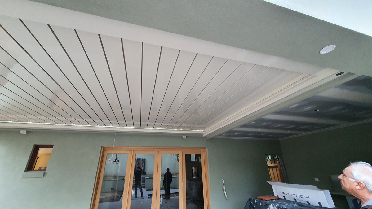 With dimensions undertaken carefully and with precision the build went according to plan, upon arrival we packed out the two ends and bolted the motor and projected side beams to the structural timber in the void before carefully raising the heavier gutter beams containing the louvre components into their required positions via duct lifter. Minor adjustments to the connection details had to be made due to access from the roof and once fastened we were able to position the motors and undertake the electrical fit off for multiple lighting LED extras. Each Aerolux systems is fitted with two Somfy Motors, one for the Tilt function and second for the retract function.